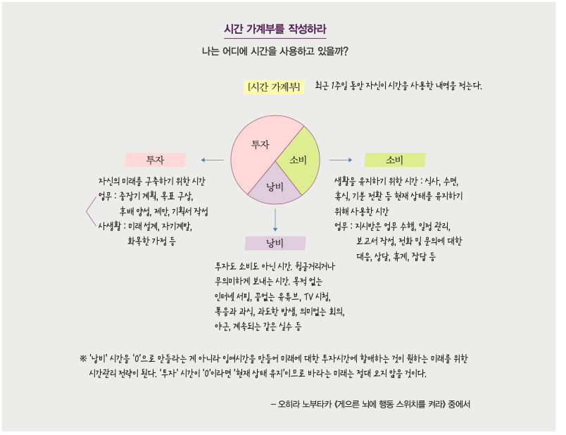 이 책에서 소개한 ‘시간 가계부’는 시간 사용을 다음 세 가지로 분류합니다: