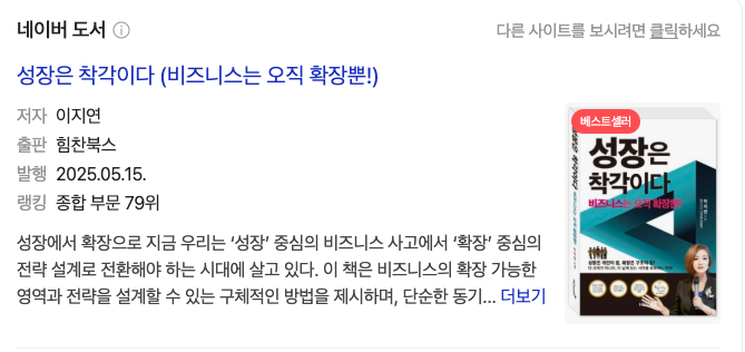 이지연 저자의 책 [성장은 착각이다 (비즈니스는 오직 확장뿐!)]은 2025년 5월 15일 현재 교보문고 온라인 일일베스트 2위, 네이버 베스트셀러 인증을 받은 책이랍니다.