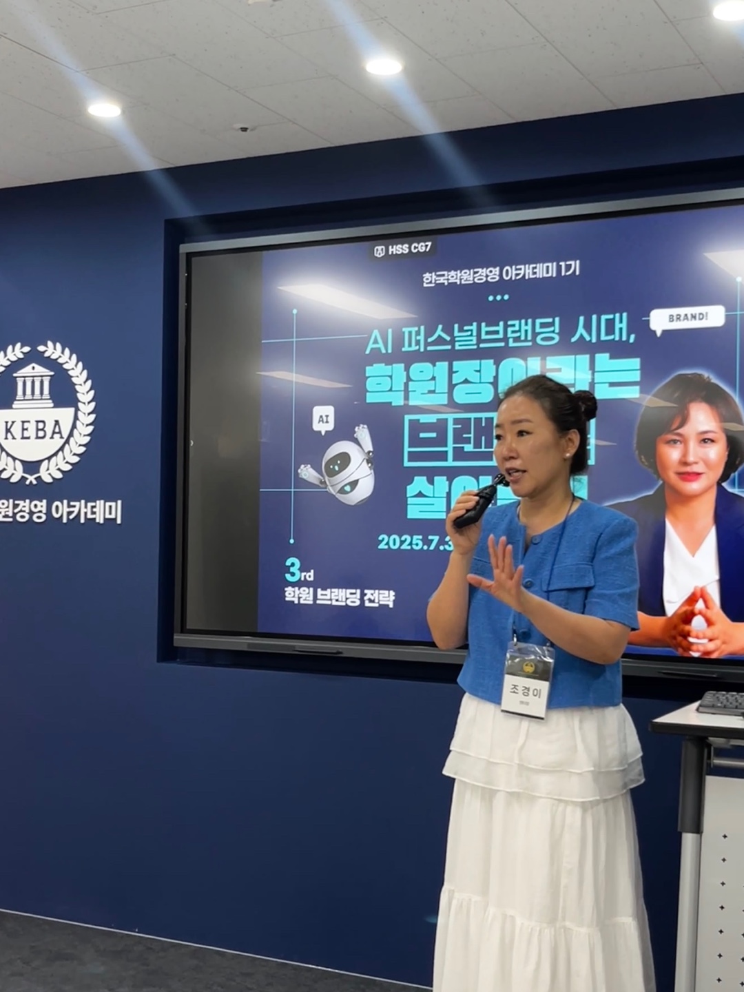 2025년 7월 23일, 한국학원경영 아카데미 1기 강의장에서 조연심 대표는 “AI 퍼스널브랜딩 시대, 학원장이라는 브랜드로 살아남기”를 주제로 학원장 대상 브랜딩 전략 특강을 진행했다.