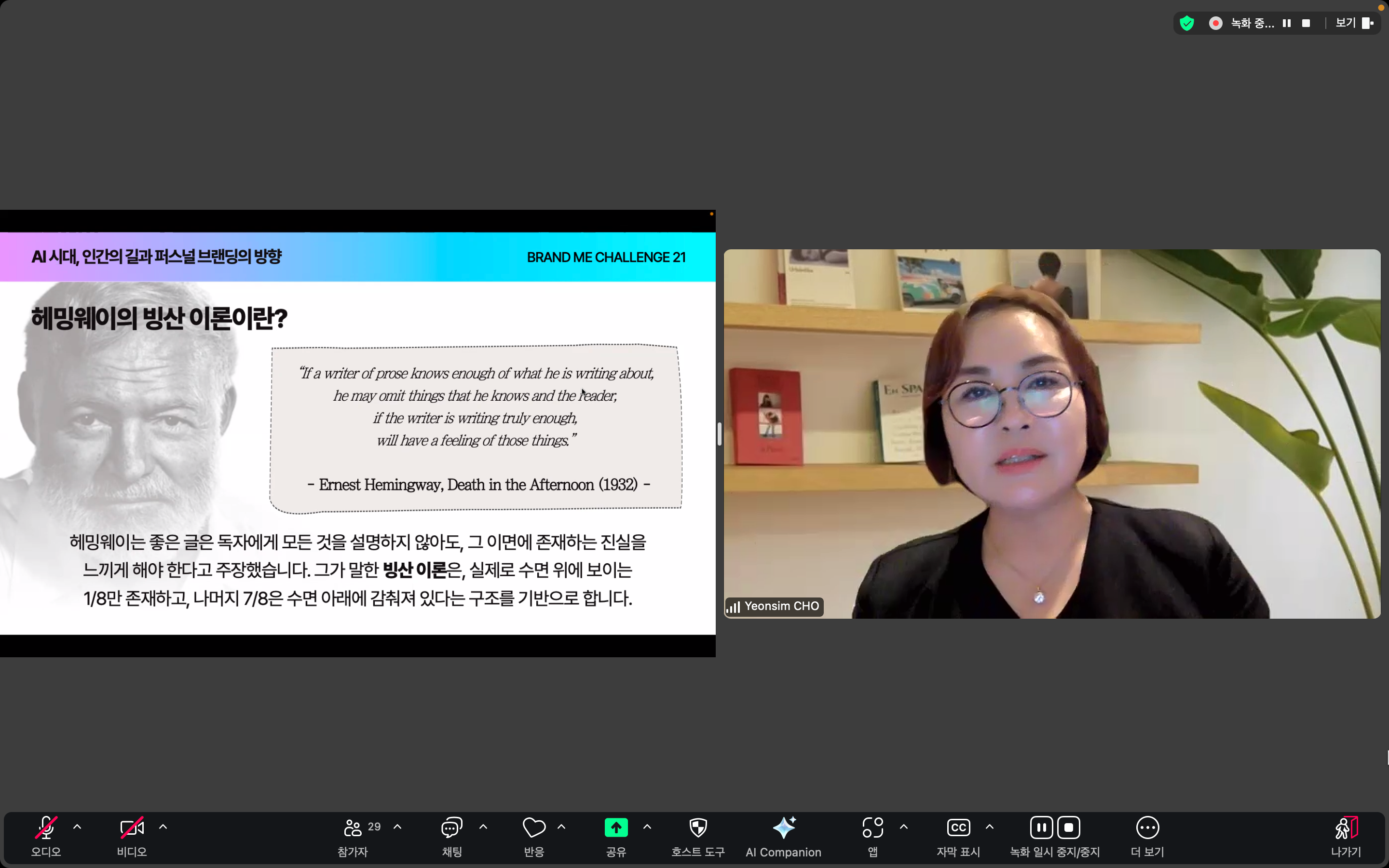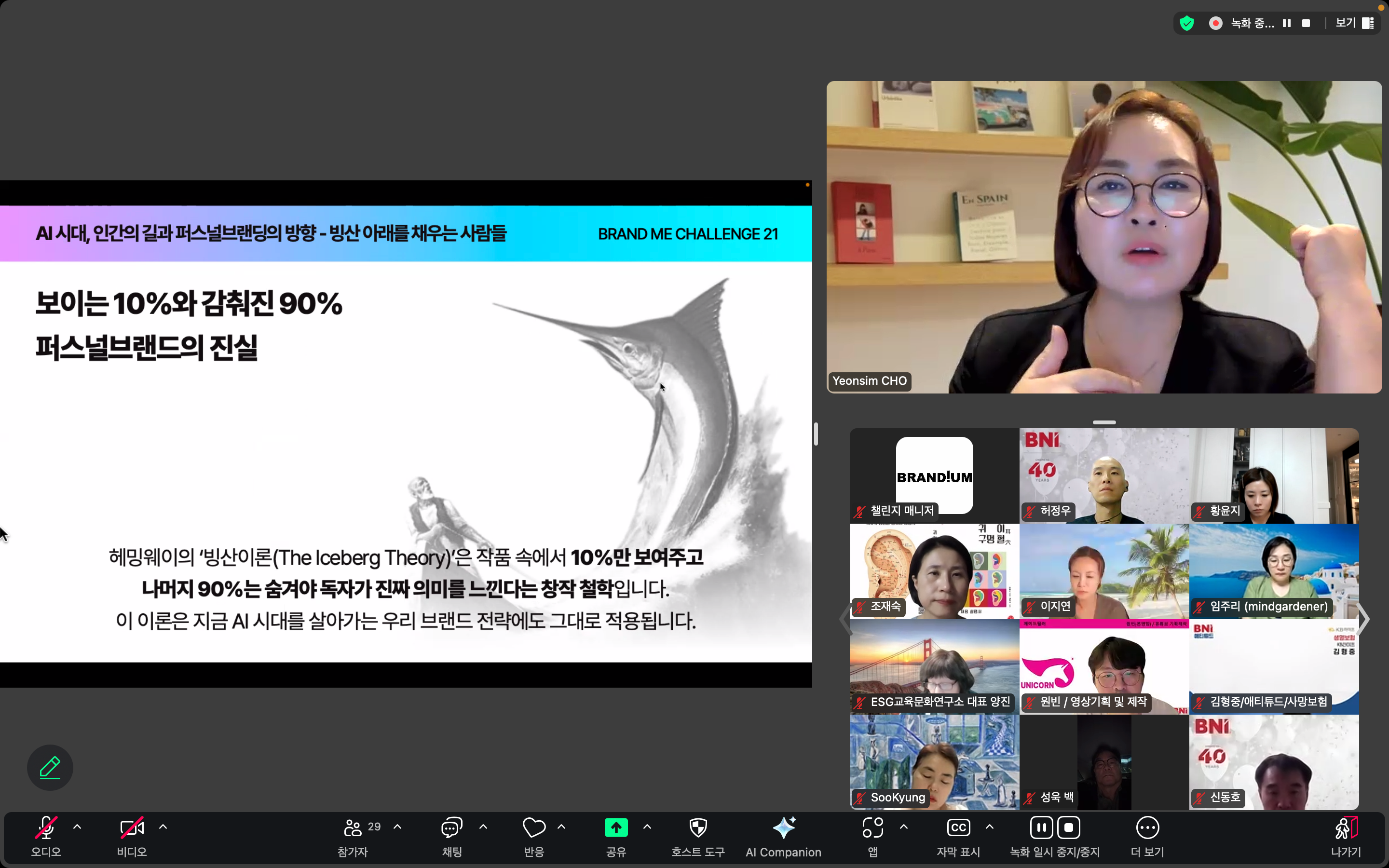 2025년 7월 31일 밤 9시, 지식소통가 조연심의 무료 오픈특강이 줌(Zoom)으로 개최되었습니다. 브랜드미 챌린지 21 런칭을 기념해 열린 이 특강에는 총 31명이 참여했고, 그 중 15명이 유료결제로 전환, 무려 **전환율 50%**라는 성과를 거두었습니다.