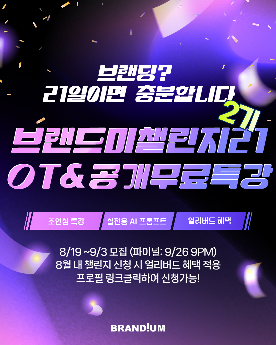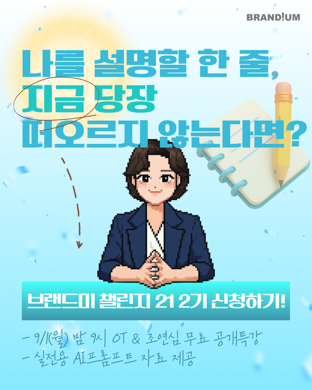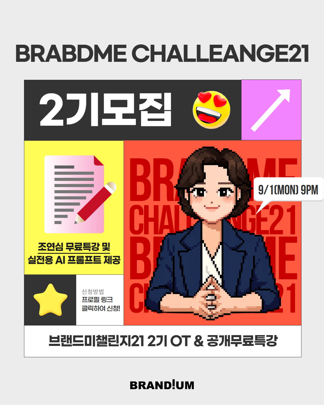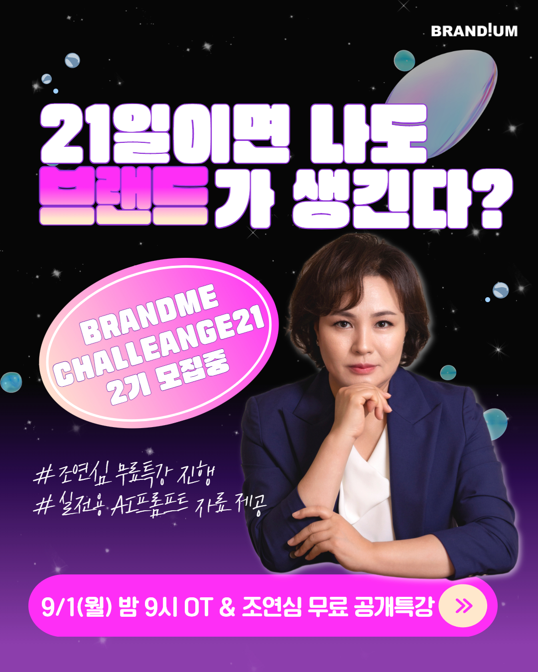 📣 9월 1일(월) 밤 9시, 누구나 참여 가능한 무료 공개특강! 퍼스널 브랜딩 입문자라면 꼭 들어야 할 조연심의 [브랜드미 챌린지21 O.T & 특강]이 열립니다. AI 브랜딩 시대를 위한 핵심 개념과 실전