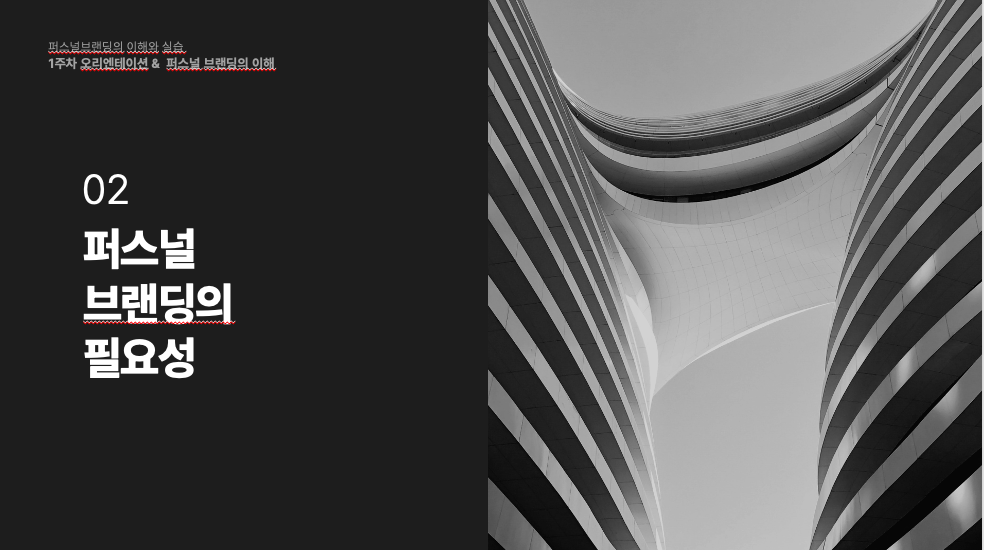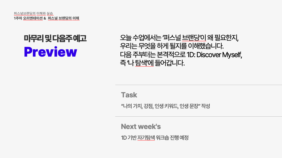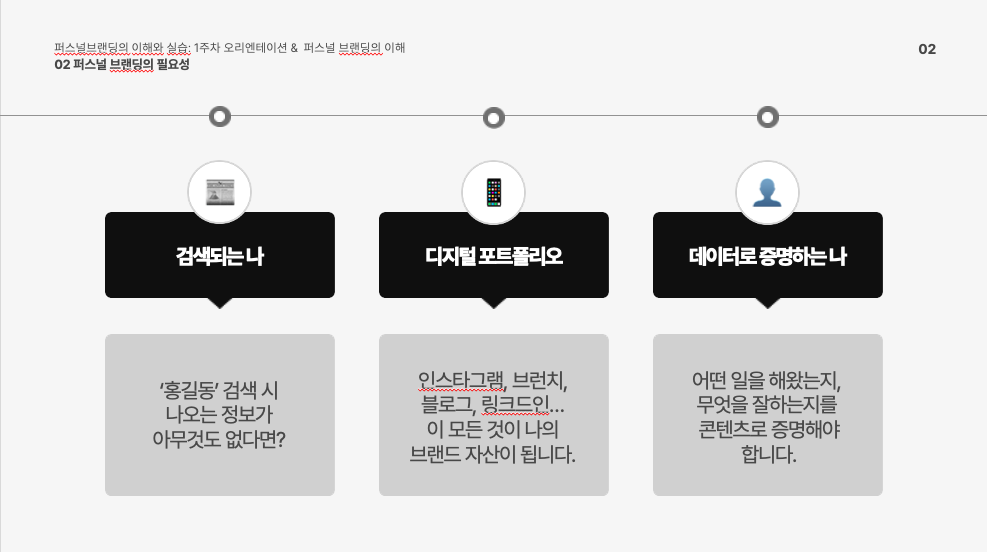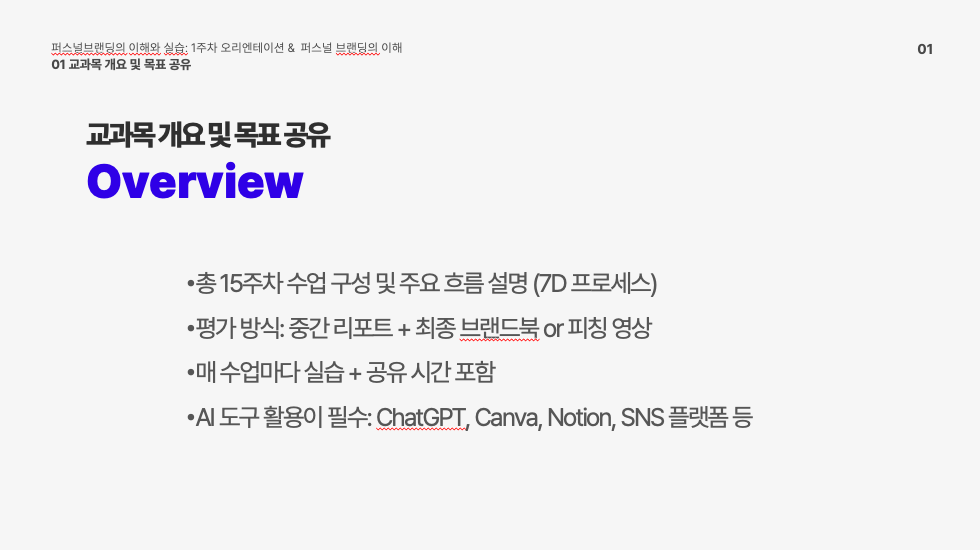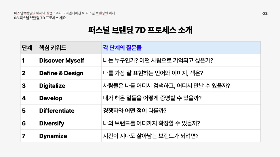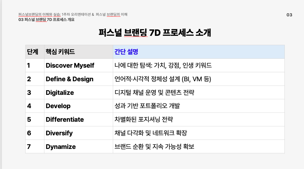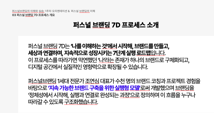 주교재로 [감으로 하는 브랜딩은 끝났다: 퍼스널브랜딩 2.0 시대]를 선정, 퍼스널브랜딩 7D 프로세스를 이해하고 설계하는 방식으로 15주차를 채워나갈 예정입니다.