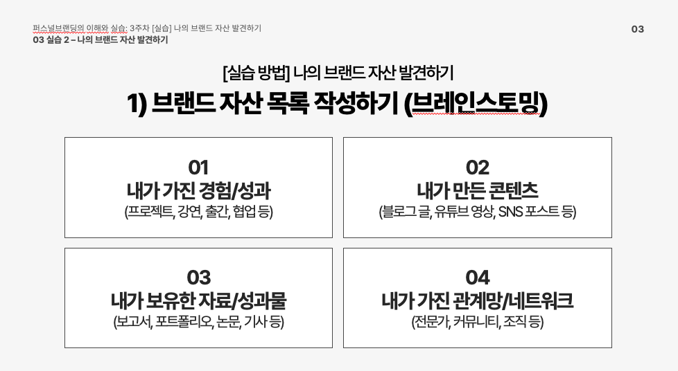 이번 주 명지대학교 교육대학원 독서코칭교육학과 퍼스널브랜딩의 이해와 실습(담당: 조연심 교수) 3주차 수업이 진행되었습니다. 이번 주제는 바로 “나의 브랜드 자산 발견하기”였습니다. 퍼스널 브랜딩은 단순히 멋진 프로필 사진이나 화려한 소개 문장을 만드는 것이 아닙니다. 1주차에서 확인했듯, 이제는 “당신이 누구인가”가 무엇보다 중요한 시대이며, 2주차에서는 이를 위해 가치·강점·역할·키워드로 나를 탐색하는 시간이 필요했습니다. 그리고 3주차에 들어서면 본격적으로 내가 가진 브랜드 자산을 발견하고 정리하는 과정이 시작됩니다.