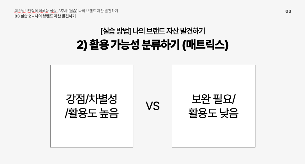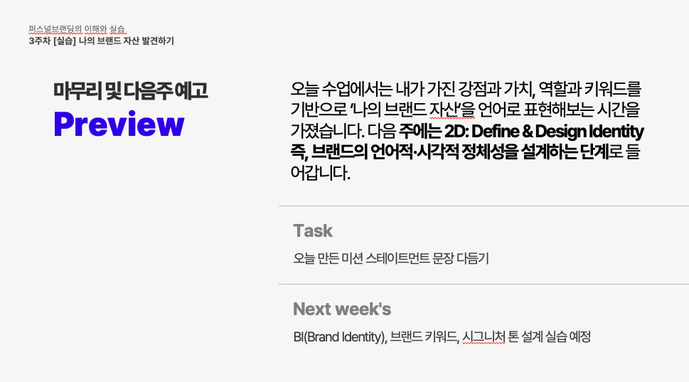 3주차의 핵심은 “내가 이미 가진 브랜드 자산을 발견하고, 이를 언어화·체계화하는 것”입니다. 이 과정은 단순한 정리 작업이 아니라 앞으로 어떤 브랜드로 성장할지를 결정짓는 중요한 발판입니다. 다음 주에는 이를 바탕으로 브랜드 아이덴티티(BI)와 시그니처 톤을 설계하는 단계로 넘어가게 됩니다.