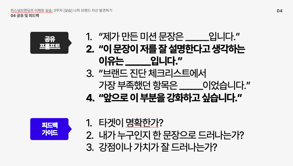 브랜드 자산을 정리하기 전에, 나를 가장 잘 표현하는 개인 미션 스테이트먼트를 작성하는 것이 중요합니다.