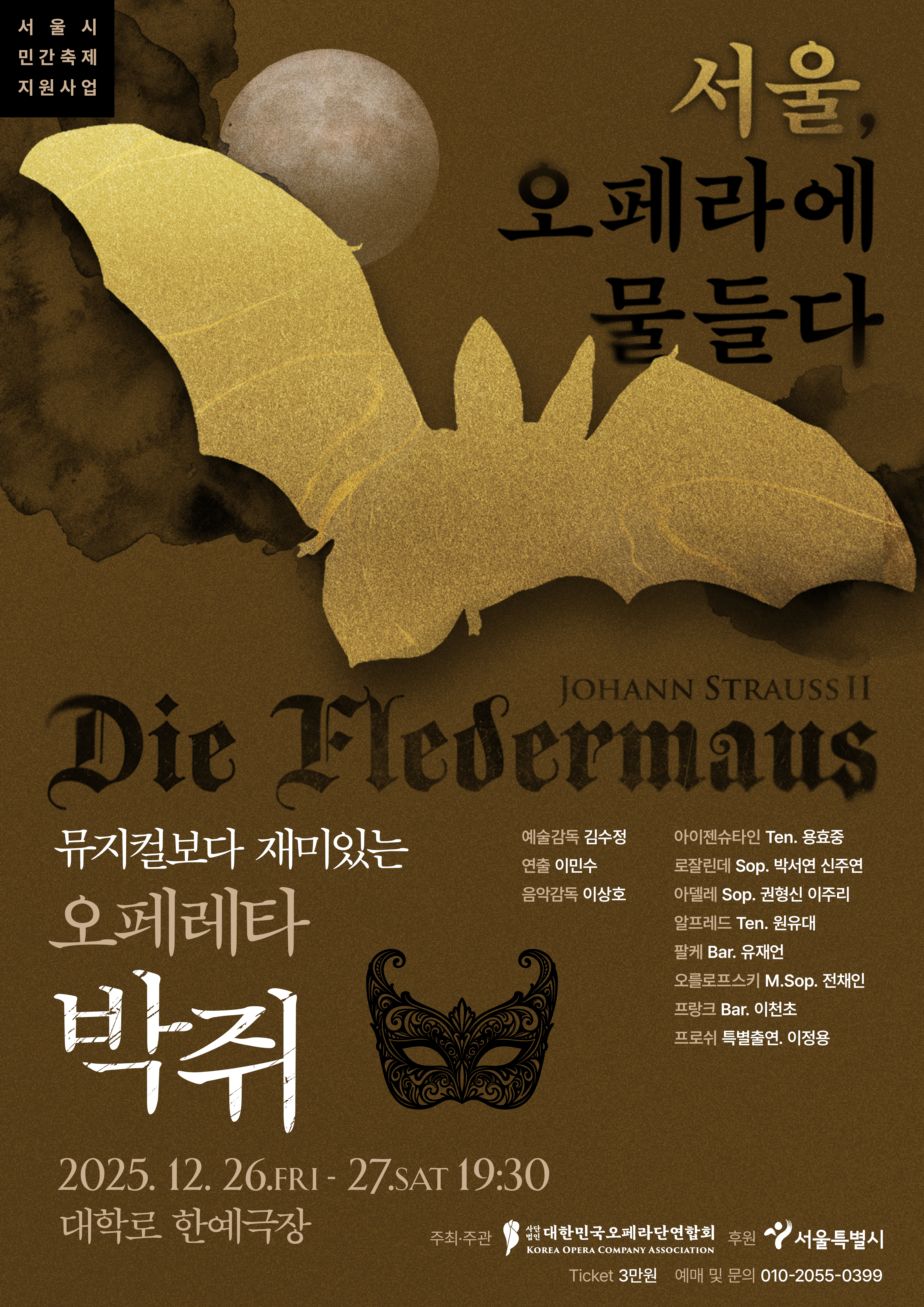 2025년 연말, 서울 대학로 한예극장에서 오페레타 〈박쥐〉(Die Fledermaus)가 관객을 맞이합니다. 요한 슈트라우스 2세의 대표작이자, ‘뮤지컬보다 재미있는 오페레타’로 알려진 이 작품은 올해 문화생활을 고민하는 이들에게 확실한 선택지가 됩니다.