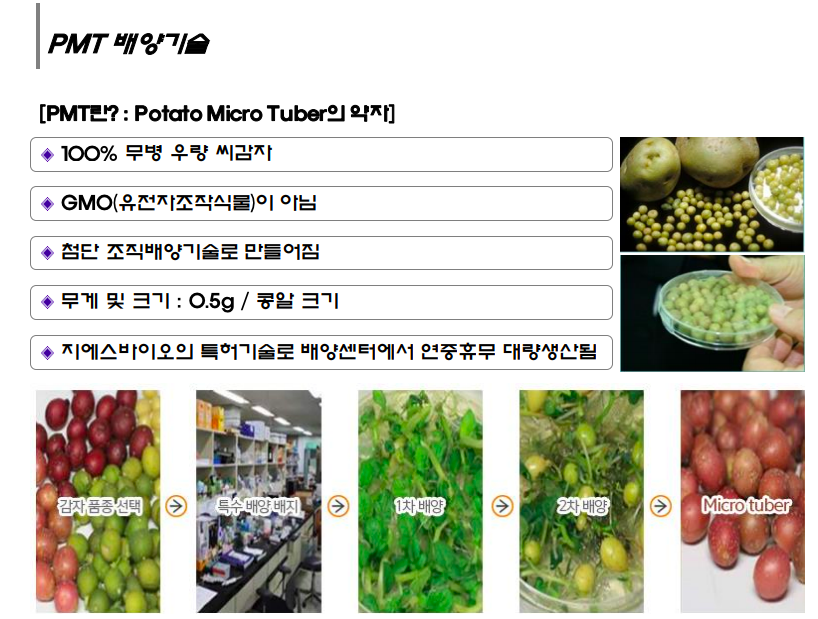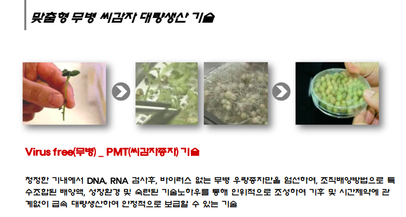 저희 회사가 배양한 씨감자는 땅속에 들어가도 면역력이 강해 바이러스에 쉽게 감염되지 않고 자생력이 강해 건강한 씨감자가 됩니다. 특히 어떤 종류의 감자라 하더라도 기존 감자원가의 10분의 1 가격으로 대량생산이 가능한 경쟁력 있는 기술을 가지고 있습니다. 핵심기술 중 하나가 실내에서 연중 생산이 가능하고, 좁은 면적에서 많은 양의 씨감자가 생산되어 필요한 물량을 얼마든지 조절할 수 있습니다. 게다가 부피가 작아 보관이 용이하고 물류비와 보관비 또한 현저히 줄여줄 수 있다는 게 강점입니다. 물론 저희의 배양기술은 감자뿐만 아니라 딸기, 고구마, 생강 등 다른 작물도 가능합니다. 줄기로 자라는 작물은 다 적용가능합니다. 앞으로 질 좋고 양 많은 작물생산에 많은 기여를 할 수 있기에 농업생산 발전에도 기여를 할 수 있습니다.