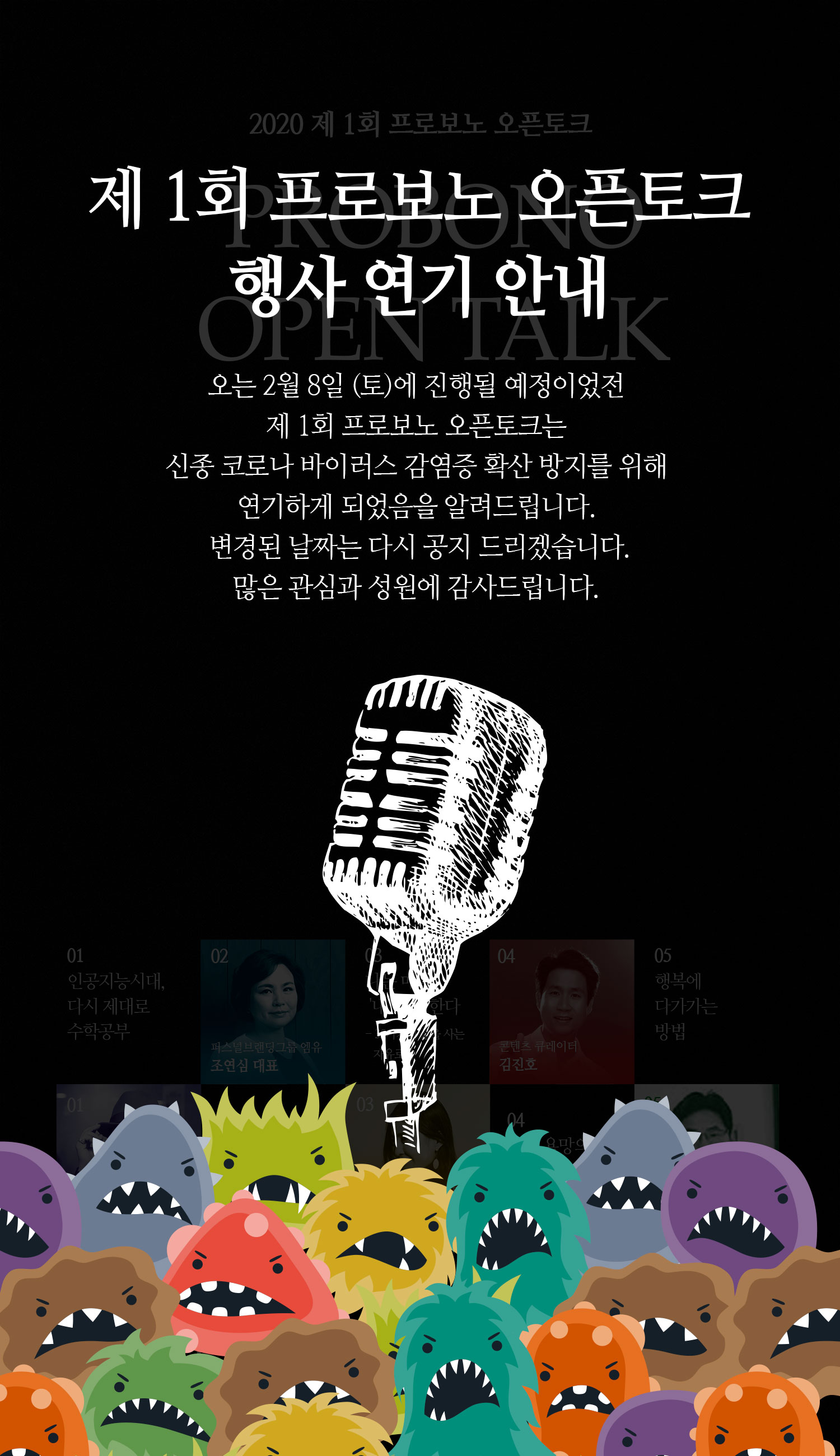 구정 후 기획했던 제1회 프로보노 오픈토크가 신종 코로나 때문에 연기되었습니다. 모두 안전해지는 그 때 건강한 모습으로 다시 만나요~~~