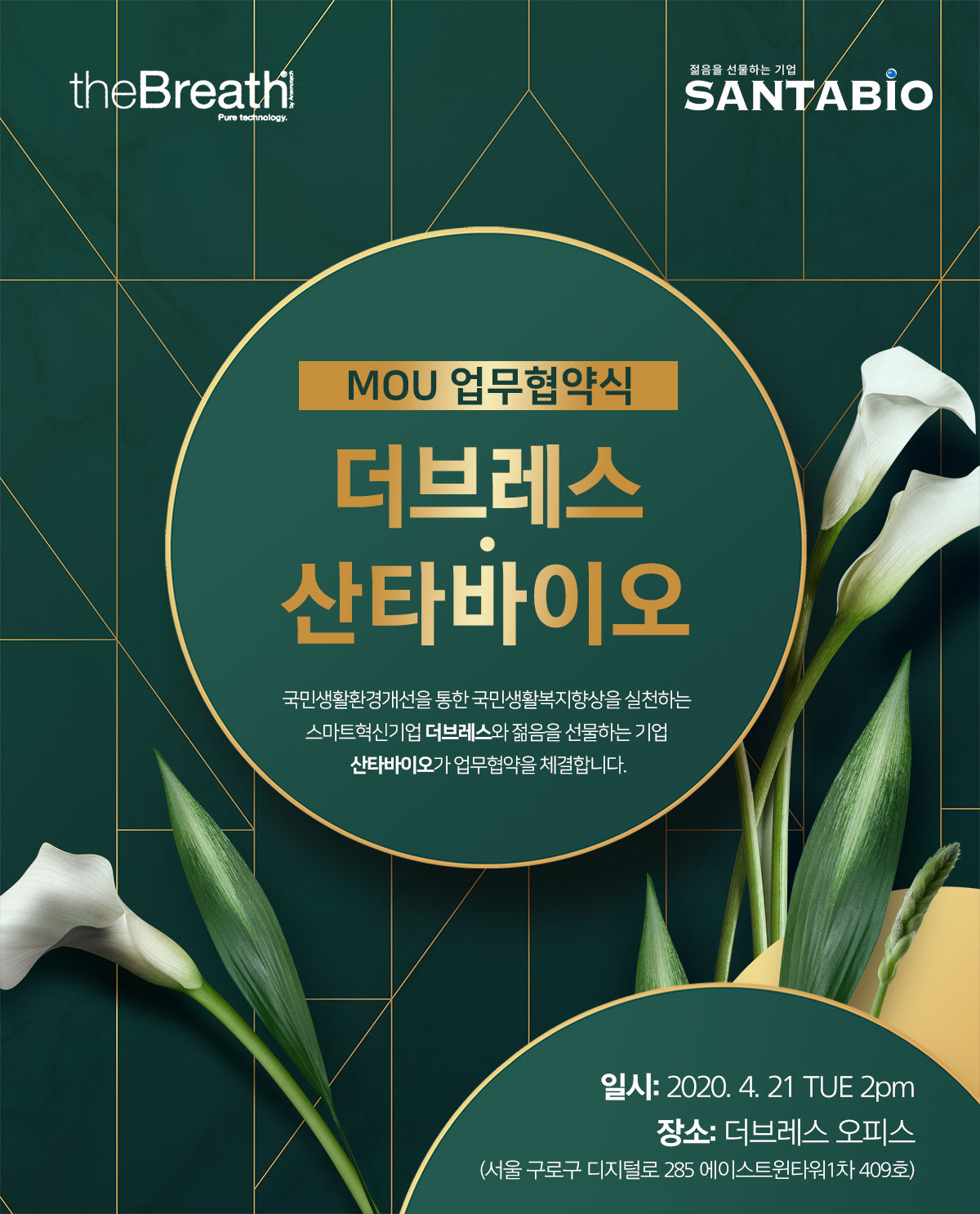2020년 4월 21일 화요일 오후 2시 구로 에이스트윈타워 1차 409호 더브레스 오피스에서 국민생활환경개선을 통한 국민생활복지향상을 실천하는 스마트혁신기업 더브레스와 젊음을 선물하는 기업 산타바이오의 업무협약식이 진행되었다.