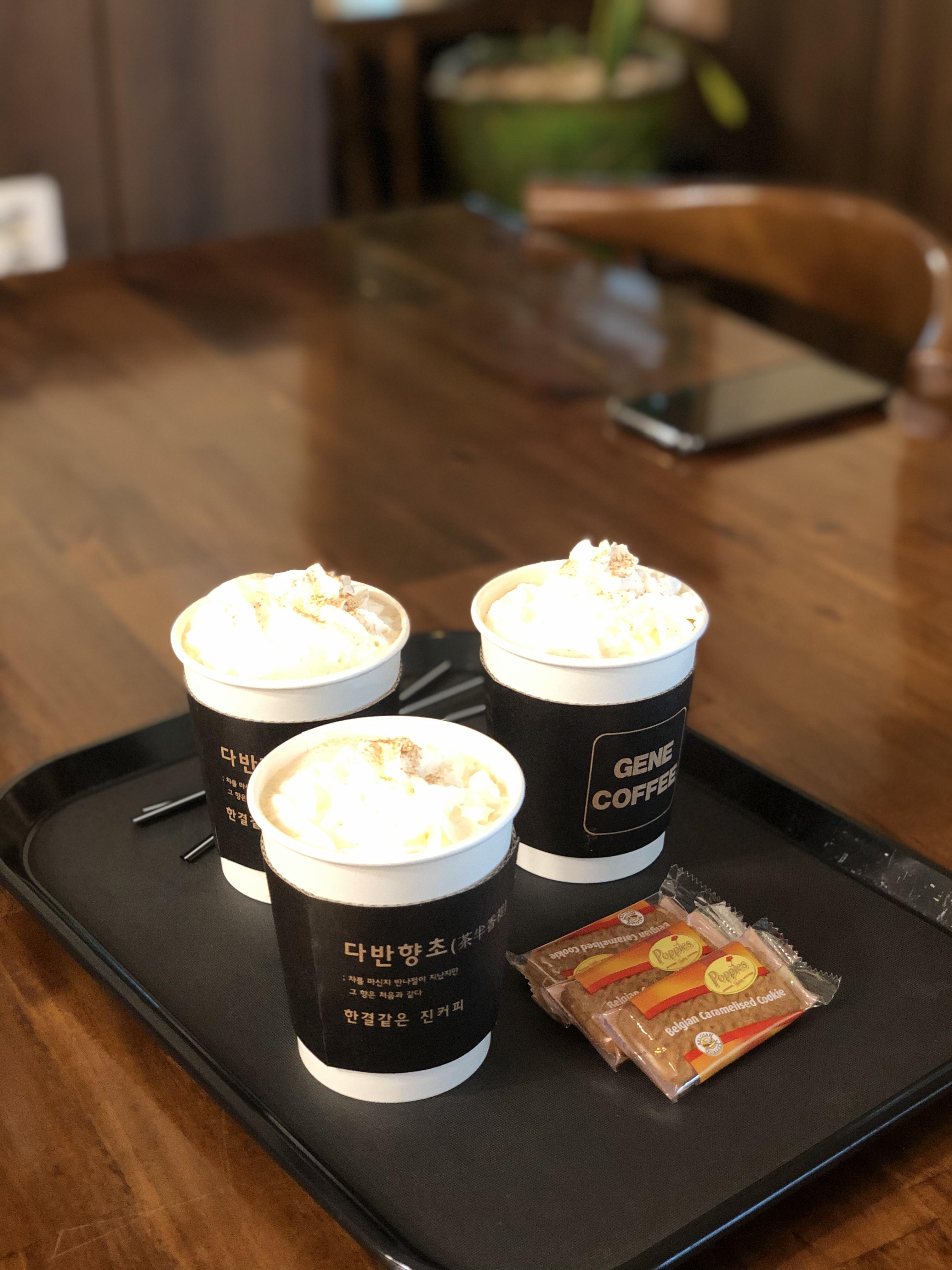 셋, 줄서서 기다리다 부대찌개로 점심 먹고 커피숍에서 비엔나 커피 한 잔씩 마시면서 아이디어 대방출!