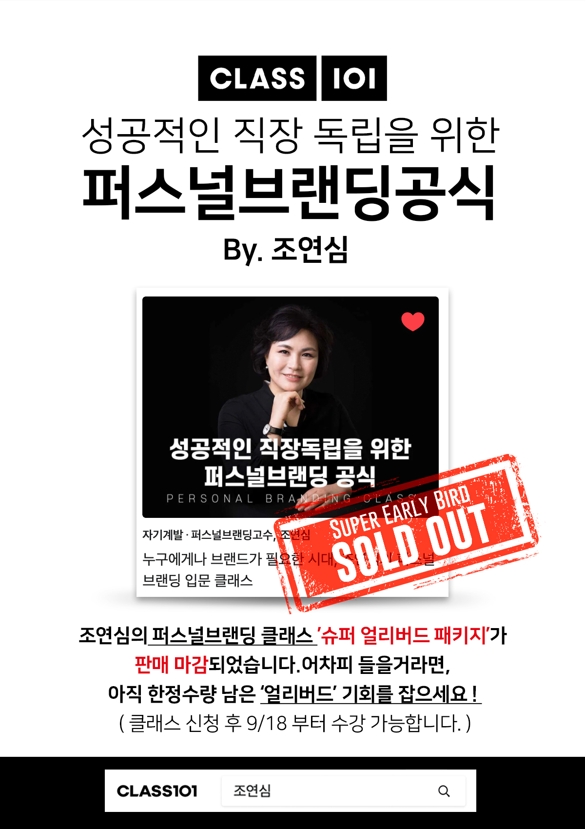 셋, 대한민국 최고 온라인취미사이트 #클래스101 커리어 부분 [성공적인 직장독립을 위한 조연심의 퍼스널브랜딩 공식] 슈퍼얼리버드 전량 매진으로 이제 9월 18일 영상 오픈을 위한 PD와의 미팅이 진행되고 있습니다. 오늘은 클래스101 페북 광고 1면에서 저를 계속 만났다고 제보해주시는 분들 덕분에 행복한 하루였답니다. 벌써 제 클래스101 강의 + 책 #퍼스널브랜딩에도공식이있다 연계 스터디모임도 만들어졌다는 기쁜 소식을 들었답니다. 영상 잘 준비해 보겠습니다.
