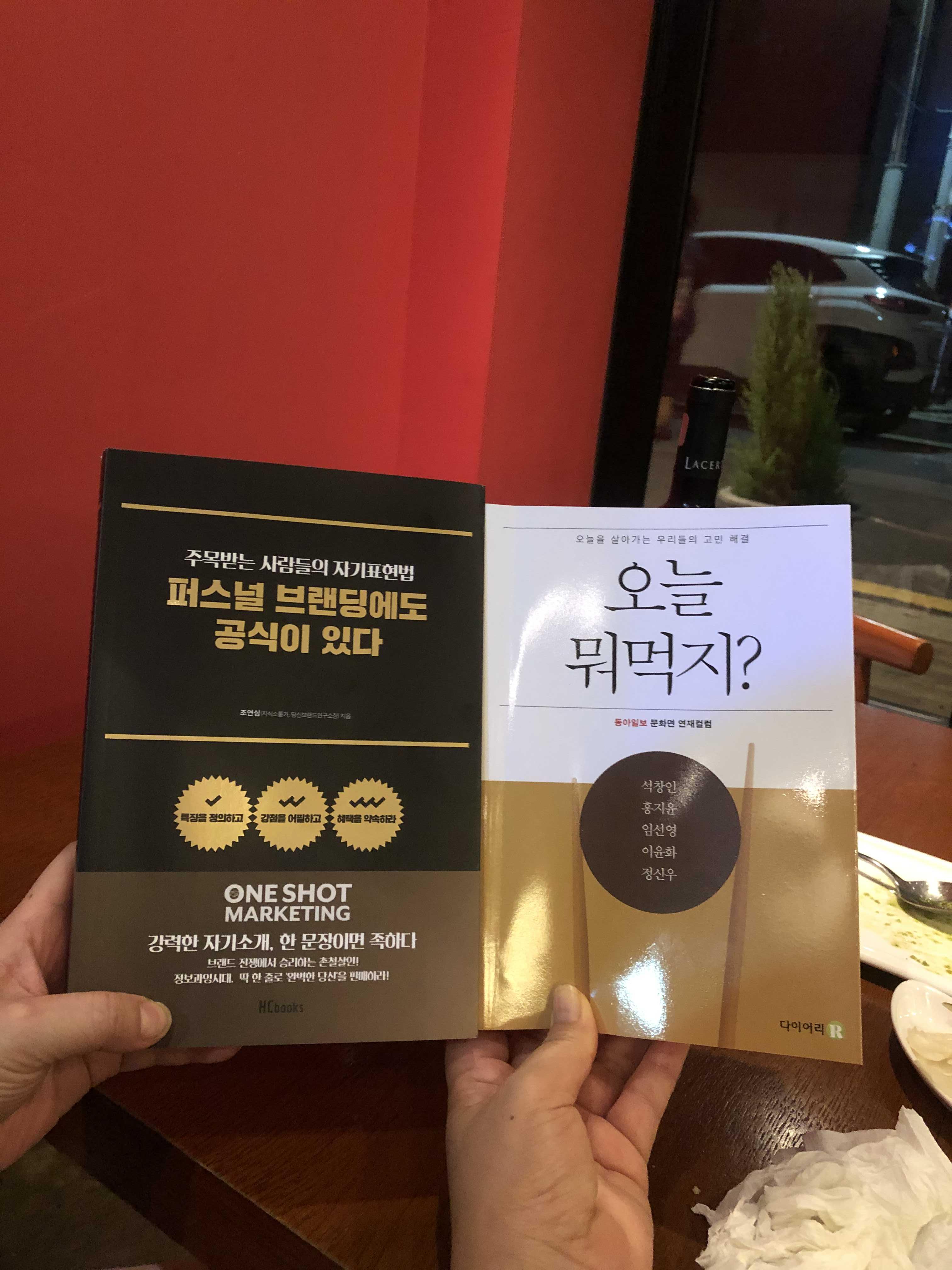 셋, 식문화콘텐츠개발자이자 시스트로 이윤화 대표님과 만나 서로 사인한 책 교환하고 회포를 풀었습니다. 너무 짧은 시간이지만 언제 만나도 든든하고 유쾌한 모습이라 보기 좋은 사람이랍니다. #오늘뭐먹지 는 신문 연재칼럼을 모아 만든 책이랍니다. 이 책 한 권이면 선택장애는 없어질 둣합니다. 이윤화 대표님 책과 가게 모두 대박 기원할게요. 시스트로 요리는 진짜 짱이에요.