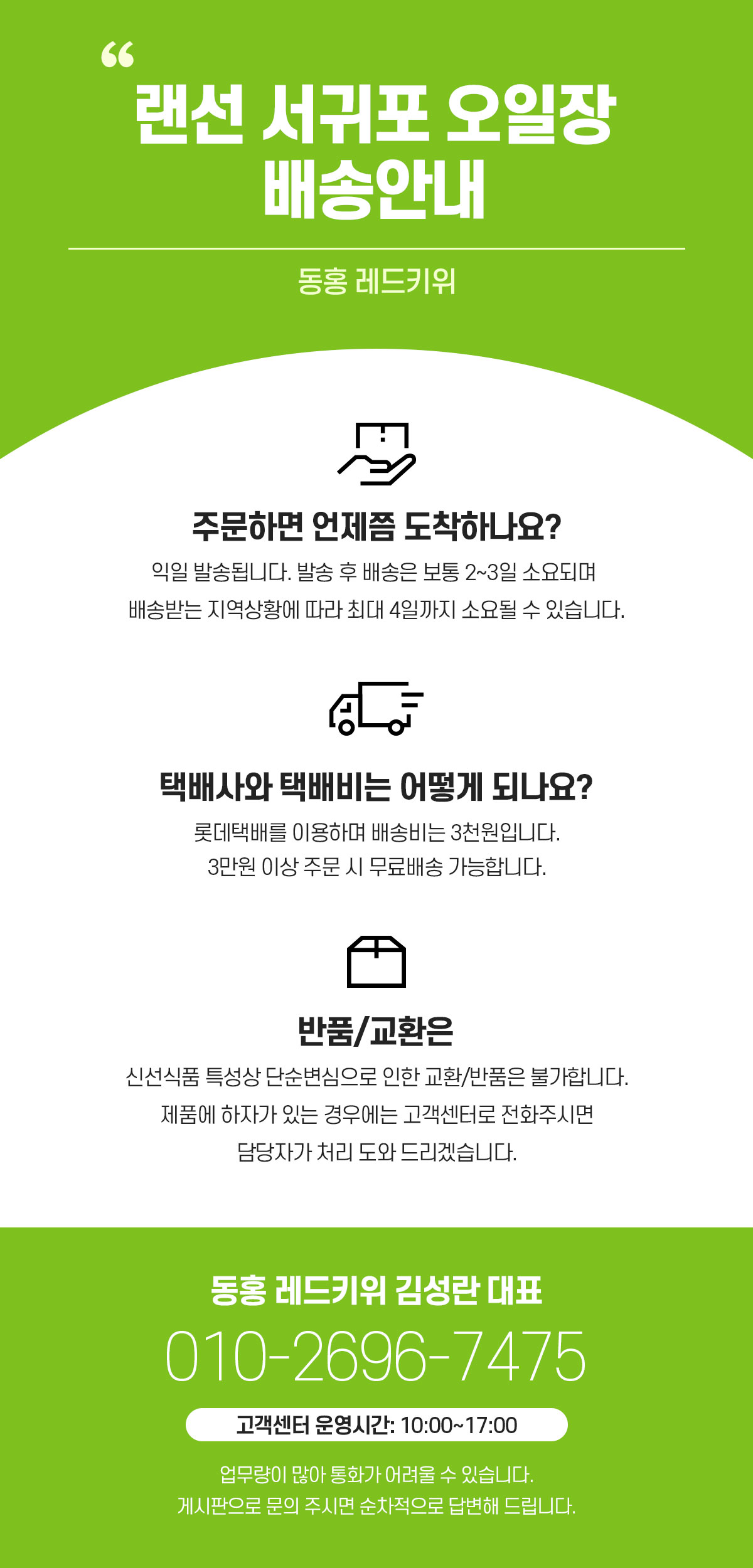 제주도 파더스가든, 동홍레드키위, 동일수산, 아리랑상회, 서귀포향토오일시장, 멘도롱오메기떡 사장님들도 좋은 물건 빠르게 배송해주셔서 감사했습니다.