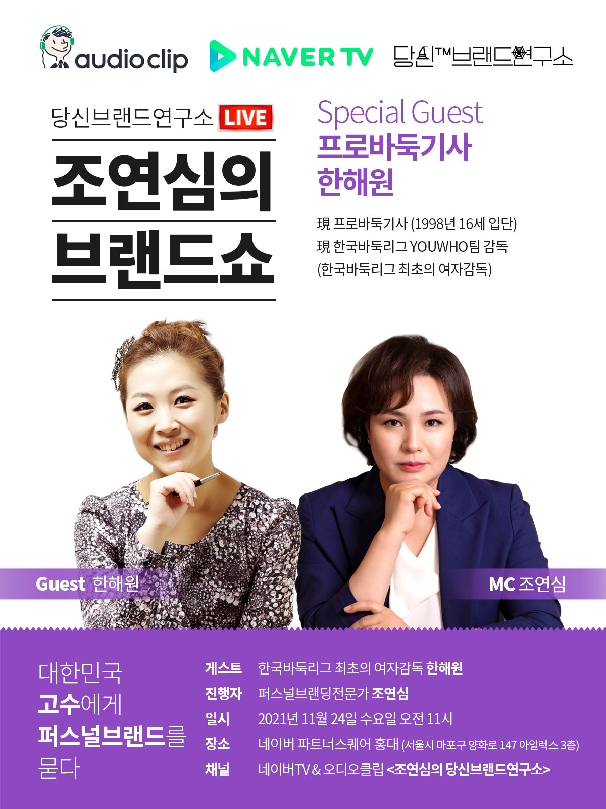 내일 오전 11시 네이버 오디오클립 #당신브랜드연구소 #네이버TV #조연심의브랜드쇼 게스트로 전 프로바둑기사이자 현 프로바둑팀 감독이신 #한해원 대표님을 모십니다.
