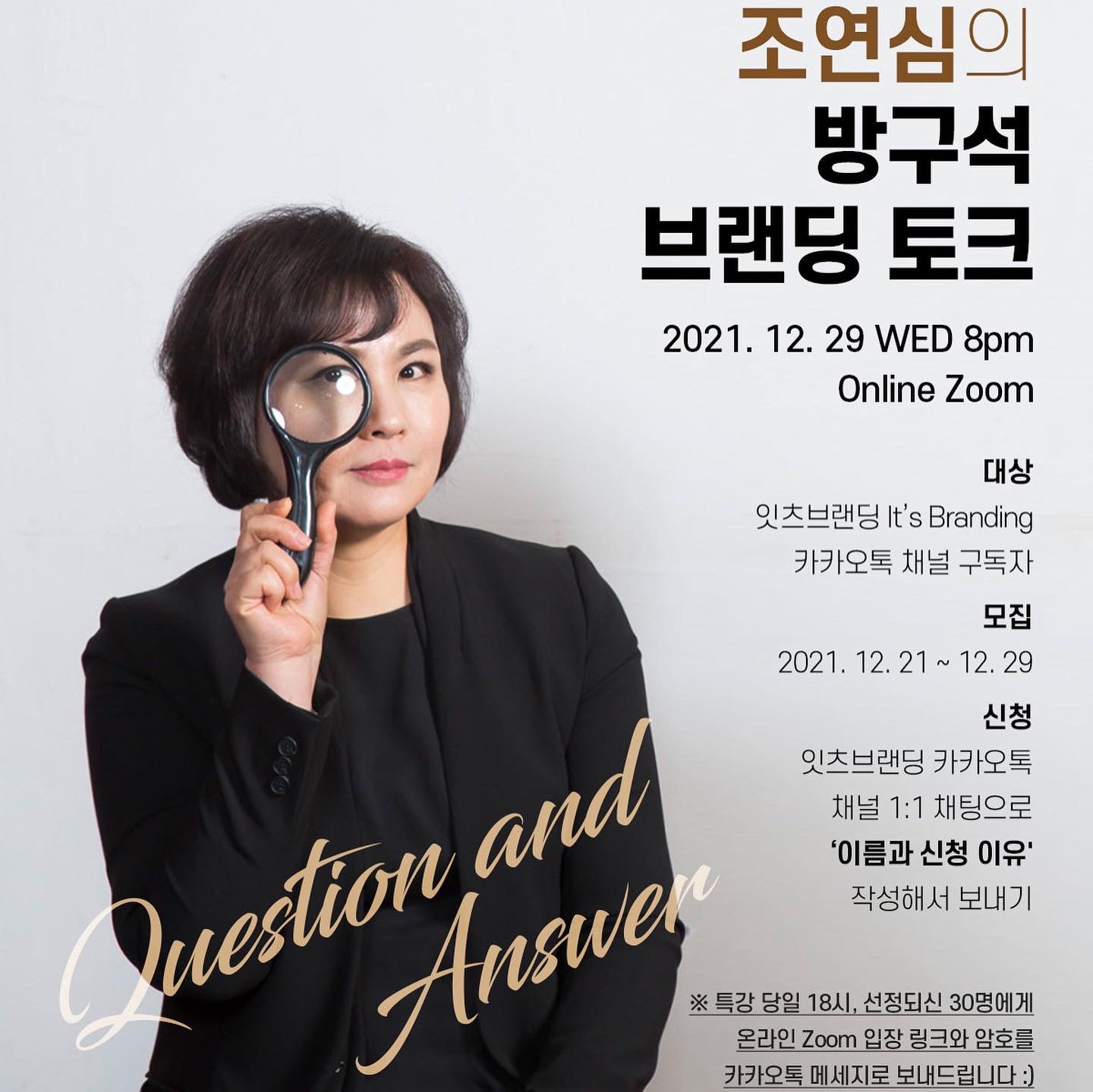 2021년의 마지막 수요일, 퍼스널브랜딩 전문가 조연심과 브랜딩에 대해 자유롭게 이야기 나눌 수 있는 시간을 준비했습니다. 랜선 송년회, 잇츠브랜딩과 함께 해요❤︎