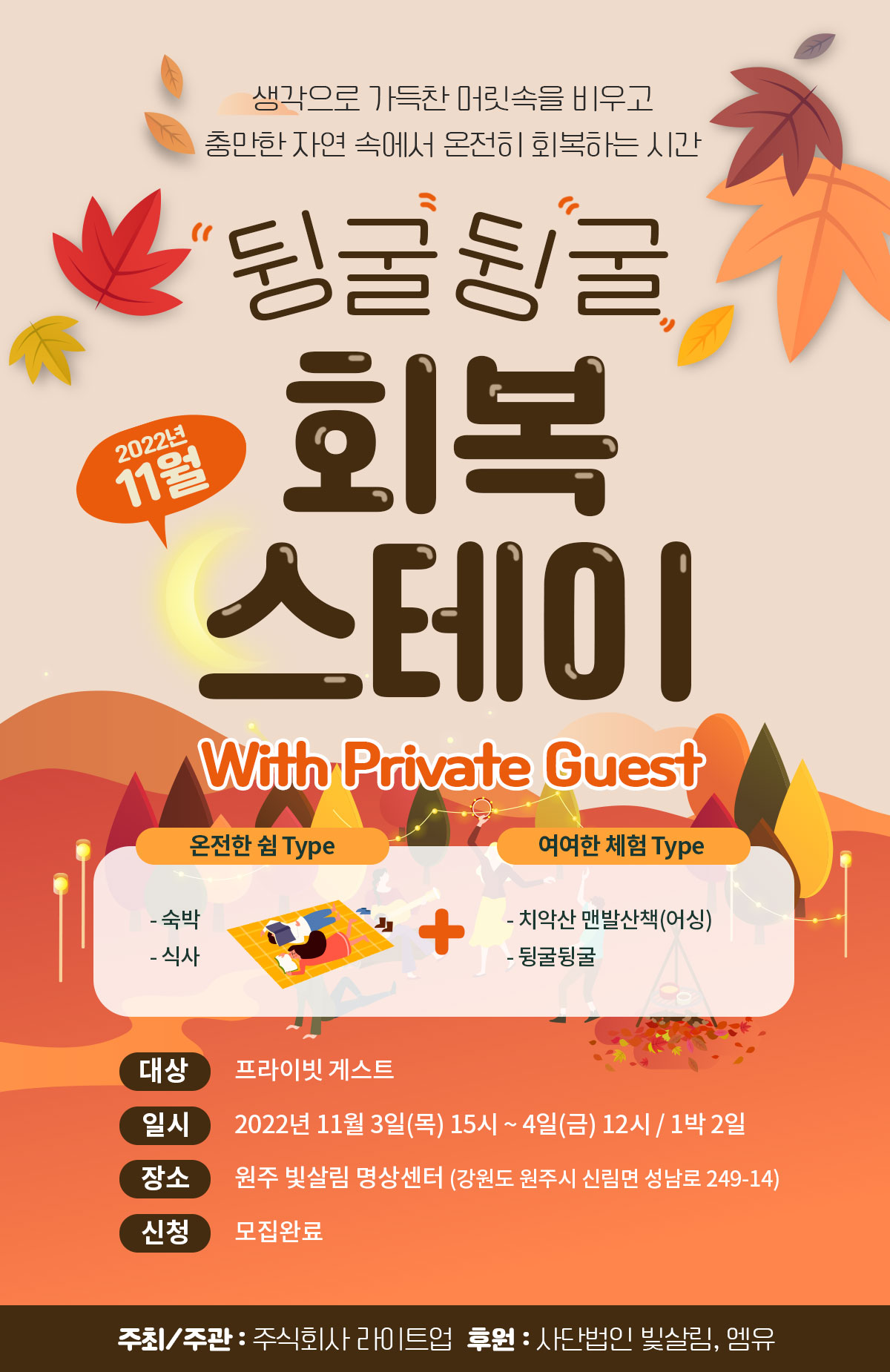 이번 2022년 11월 뒹굴뒹굴 회복 스테이는 프라이빗 게스트 초청으로 이미 마감되었답니다.