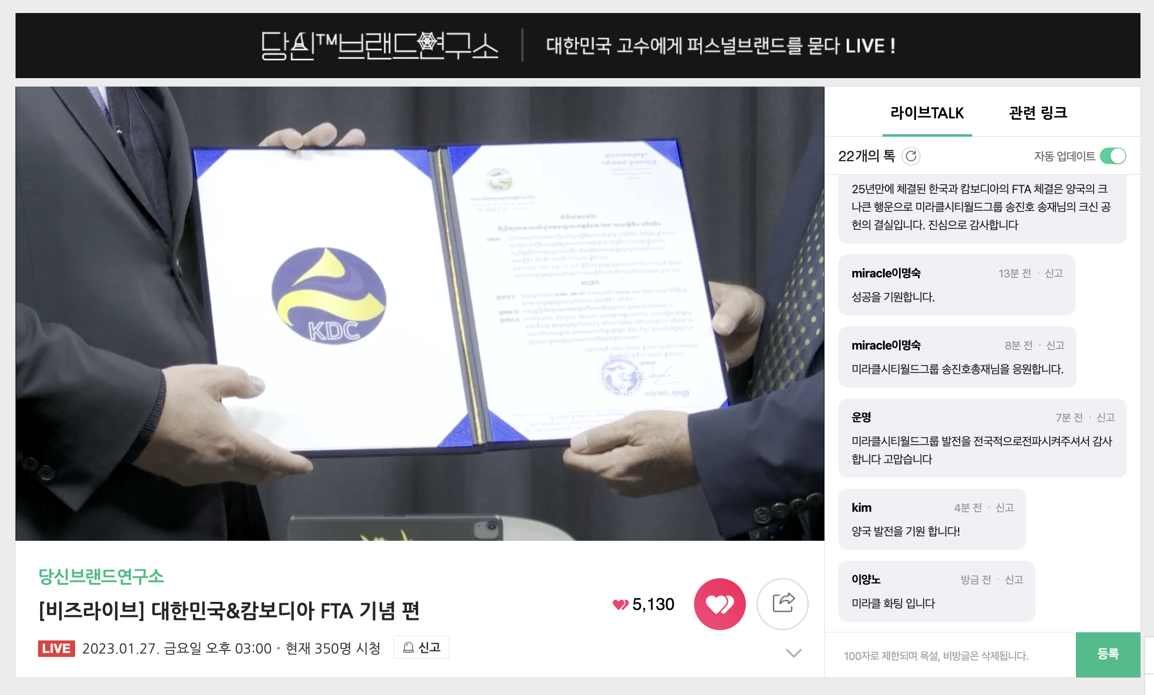 [네이버나우 당신브랜드연구소 조연심의 비즈라이브] 대힌민국 - 캄보디아 FTA 공식 승인 축하 기념 라이브 방송 / 미라클시티월드그룹
