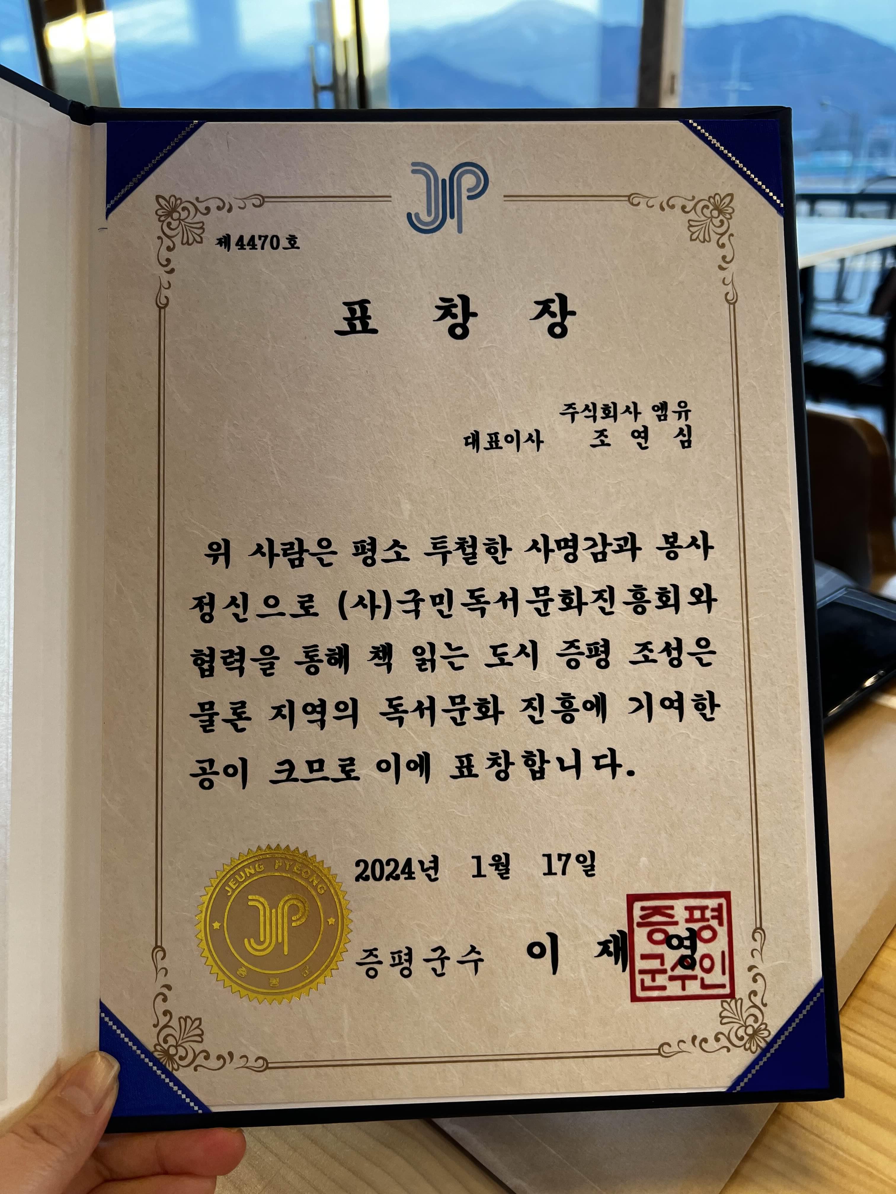 표창장을 주신 이재영 증평군수님 고맙습니다.
