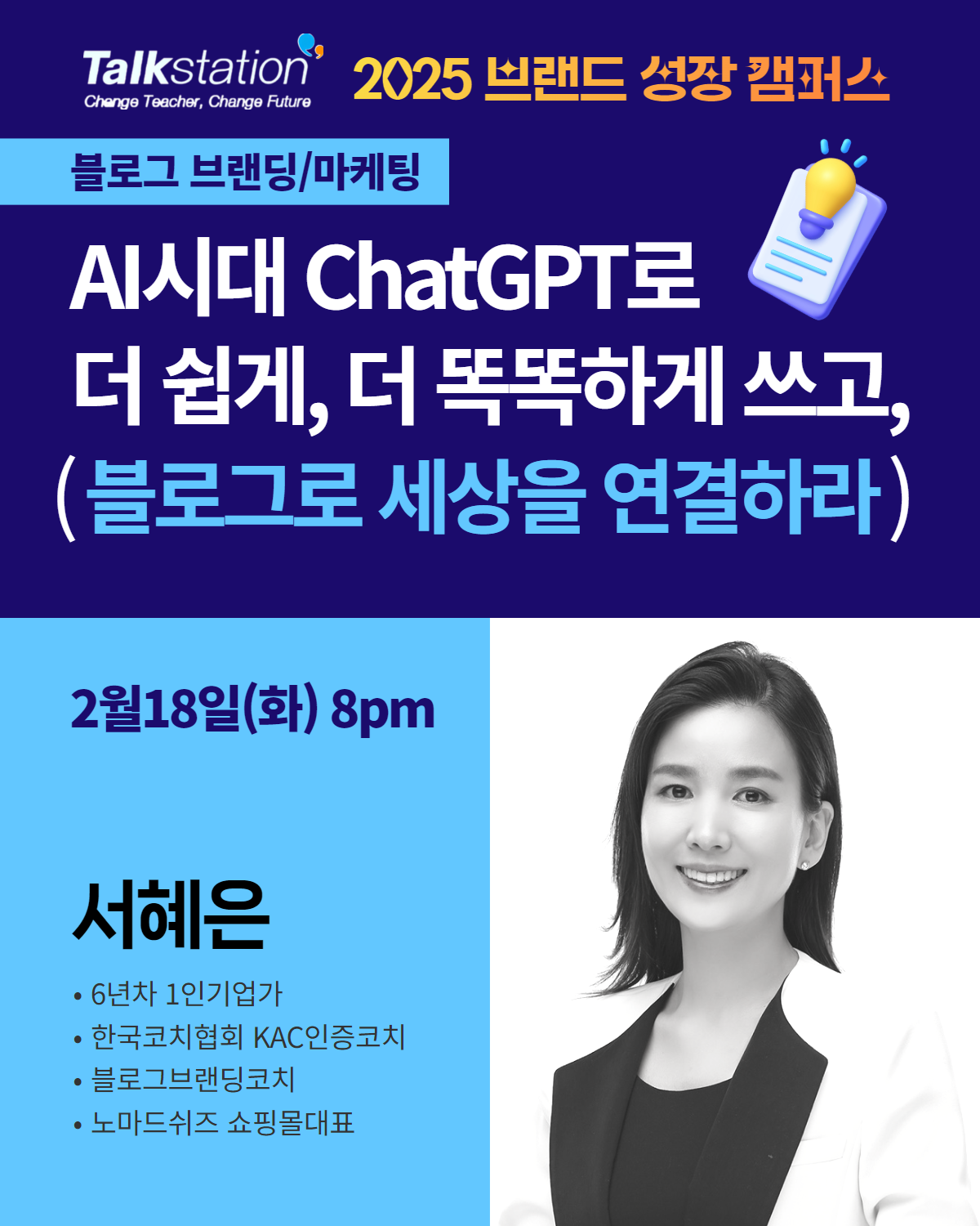 2주차 :ChatGPT와 블로그를 활용한 콘텐츠 제작 / AI 시대, 챗GPT로 더 쉽게, 더 똑똑하게 쓰고, 블로그로 세상을 연결하라 (서혜은 블로그브랜딩코치)