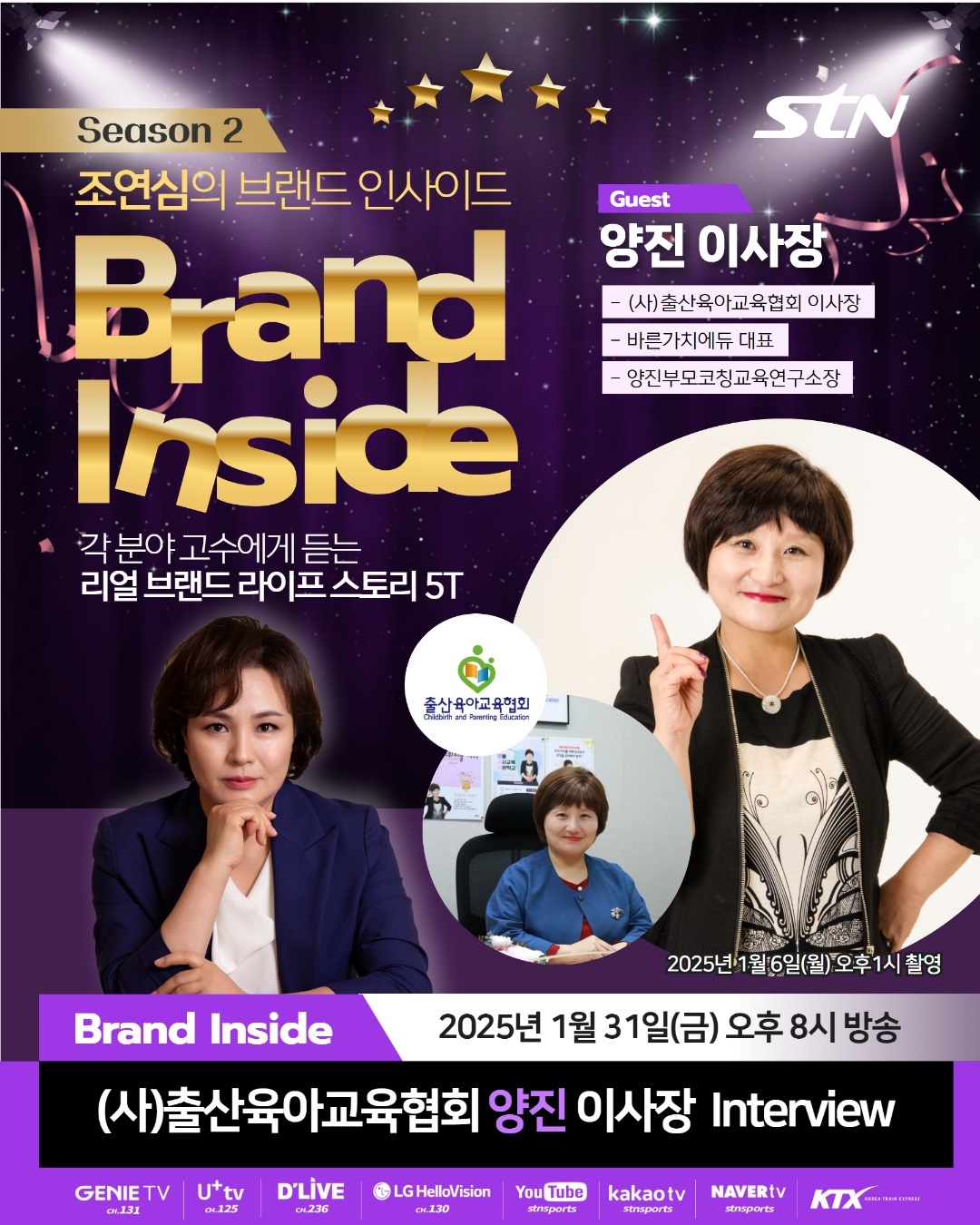스포츠전문채널 STN의 인기 토크쇼 프로그램 '조연심의 브랜드 인사이드'가 출산육아교육 분야의 전문가를 모시고 특별한 이야기를 나눕니다. 이번 편에서는 사단법인 출산육아교육협회 양진 이사장이 출연하여 출산과 교육의 중요성에 대해 심도 있는 대화를 나눌 예정입니다.