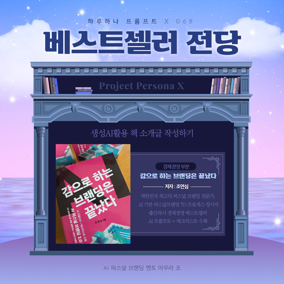 안녕하세요! 퍼스널 브랜딩 일인자, 그리고 AI 퍼스널 브랜딩 전문가로 기억될 아우라 조입니다. 오늘도 여러분의 창작을 한 단계 업그레이드할 AI 활용법을 소개해 드릴게요! 제가 진행하는 퍼스널 브랜딩 고도화 프로젝트, 그중에서도 하루 하나 프롬프트를 발행하는 PPX100(Project Prompt X 100) 알고 계신가요? 이 프로젝트를 통해 AI 활용도를 높이고, 창작과 브랜드 구축에 필요한 강력한 프롬프트를 제공합니다. 오늘은 생성형 AI를 활용한 책 소개글 만들기를 다뤄볼게요!