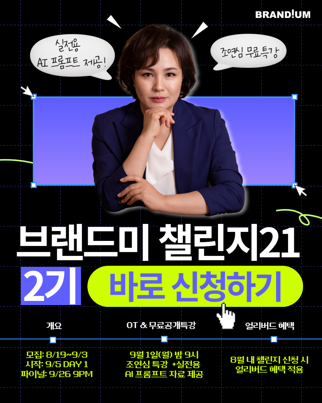 📣 9월 1일(월) 밤 9시, 누구나 참여 가능한 무료 공개특강! 퍼스널 브랜딩 입문자라면 꼭 들어야 할 조연심의 [브랜드미 챌린지21 O.T & 특강]이 열립니다. AI 브랜딩 시대를 위한 핵심 개념과 실전